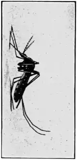 | Fig. 8. Profile of Anopheles punctipennis (Female). Three times larger than life. Showing the characteristic resting position of this mosquito. | Fig. 9. Profile of a Culex Mosquito (Female). Three times larger than life. | |