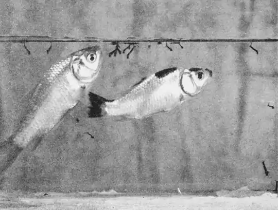 such ponds the presence of fish may account for the absence of mosquitoes. Their larvæ furnish food for many species of our smaller fishes, and by them myriads of mosquitoes are annually destroyed. Goldfish are particularly fond of mosquito 'wigglers,' and the pair of fish in the illustration (see Fig. 11) were seen to eat ninety-eight 'wigglers' in four minutes. Goldfish will live and multiply in almost any small and shallow pond in this vicinity, where the water is warm. They are perfectly hardy and will thrive just as well and perhaps better in stagnant water than they will in fresh.