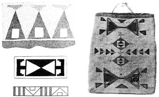| Fig. 9. Decorative Motives of the Pueblo Indians. (After Dr. W. F. Fewkes.[1]) | Fig. 10 Woven Bag of the Nez Percés. | |