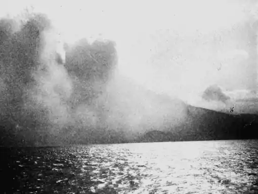 became a rattling hail diminishing to the size of peas. Fine gray ash followed in little moist and adherent globules, noiselessly sinking through the air and sticking to everything on which they landed. They were not warm, and there was a slight smell of sulphurous acid. After a few minutes the ash took the form of a gritty dry powder. The layer which fell on deck had a total thickness of one sixteenth of an inch.