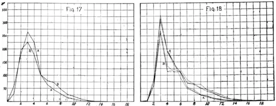 Fig. 19. Two 15,000 Word-curves from Goethe. (Table V.) (A) Dramatic prose, (B) Criticism and description. Fig. 20. (A) 400,000 Word-curve from Shakespeare; (B) 200,000 Word-curve from Bacon. (After Mendenhall.)