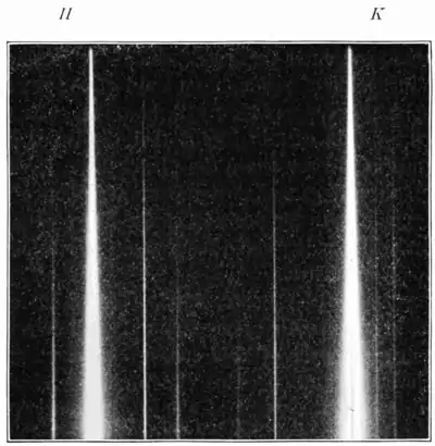 photographed. Fortunately there is a simple means of accomplishing this apparently difficult object. At the base of the flocculi the calcium vapor, just rising from the sun's interior, is comparatively dense. As it passes upward through the flocculi it reaches a region of much lower pressure, and during the ascent it might be expected to expand and therefore to become less dense. Now we know from experiments in the laboratory that dense calcium vapor produces very broad spectral bands, and that as the density of the vapor is decreased these bands narrow down into fine sharp lines (Fig. 8). An examination of the solar spectrum will show that the H and A lines of calcium give evidence of the occurrence of this substance under widely different densities in the sun. The broad dark bands, which for convenience we designate as H1 and K1, are due to the low-lying dense calcium vapor (Fig. 1). At their middle points (over flocculi) are seen two bright