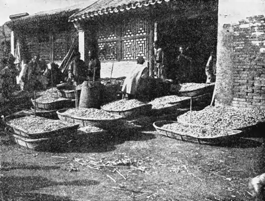 was then out of season, and later similar examinations were made at Tiensin. A very scanty but general infestation with San Jose scale was found on the different fruits examined. Perhaps one apple in a hundred would have a few of these scales about the blossom end and the same proportion was true of the haw apple and the native pear. Throughout the region where these fruits are grown, there has been no introduction of foreign stock. The occurrence of the San Jose scale on these two fruits was conclusive evidence that in the region whence it came the San Jose scale is native. The scattering occurrence of the scale also indicated, as would be anticipated, that this pest in its native home is kept in check by natural means.