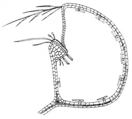 Fig. 2. A Longitudinal Section of a Bladderwort trap greatly enlarged, showing the Hairs, the Mouth and the Trap-door the leaves form a rosette-like cluster procumbent on the mud or moss and bent upward so as to give the mouth a horizontal position. The stalk is exceedingly short and the leaves, heavy with water, never rise above the surface of the swamps and bogs which are the only home of the plant. At blooming time a stalk is sent upward for a foot or more, bearing the curious leathery flowers which nod to one side in a manner which has led some one of vivid imagination to call this the 'side-saddle plant.' The water which fills all but the youngest of the leaves is simply rain-water which has fallen in, and has nothing to do with the water supply of the plant in the ordinary sense. In the water are pretty sure to be some struggling insects trying to float or to crawl up the sides of the pitcher, some others whose struggles are over, and the remaining legs and wings of still earlier victims. All sorts of flying and creeping things seem to have a natural curiosity to examine hollow caverns such as the pitchered leaves appear to them. Perhaps, too, they are drawn to the plant by its rich red coloration or the striking veins which mark the mouth of the pitcher; indeed, one botanist has found drops of honey arranged in a row up the side of the pitcher, a lure to guide the steps of the insect directly to the interior. The wing which runs up one side has been thought, too, to serve a use in preventing insects from crawling round and round the pitcher, and to direct their steps upward to the slippery edge of the mouth. Once falling from the edge into the water, slim indeed, is the chance that any but the most active of insects will get out. The sides of the interior are not only steep, but are exceedingly smooth and offer no foothold by which to regain the top. And even if the bedraggled creature should succeed in crawling up beyond the slippery zone it would encounter an array of long stout hairs crowded close together and pointing downward. Over this ambush none but the most long-legged of insects can crawl, and