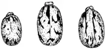 Fig. 7. Three Seeds of Castor Beans, Brown and Mottled, not easily found when thrown on the Ground. (Slightly enlarged.) By a process of selection for many generations, no doubt, seeds have acquired their present colors, and some of them are still undergoing this process.