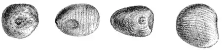 On the coast of some of the Philippine Islands, a coarse briar produces beans more or less approaching a sphere in shape.[1] They are about the size of the finger tips of a man and some of them, like peas crowded in the pod, have two flat surfaces. The color varies from moderately dark to light drab, some giving a faint greenish tinge, while the luster of many is exactly that of chert pebbles. Nearly all the specimens show a series of approximately parallel darker lines passing around, very suggestive of stratification. All are quite hard, cut only