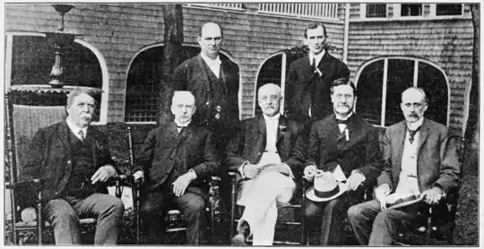 | In the center of the group is Dr. W. H. Maxwell, president of the association; at his right, Dr. Irwin Shepard, secretary; on the left of the picture is Dr. F. Louis Soldan, superintendent of instruction, public schools, St. Louis, Mo.; on the right are Albert G. Lane, assistant superintendent of schools, Chicago, Ill. and Dr. James N. Green, principal of the State Normal School, Trenton, N. J.; standing on the left is Charles D. McIver, of the State Normal and Industrial College, Greensboro, N. C. and on the right, James W. Crabtree, president of the State Normal School at Peru, Nebr. |