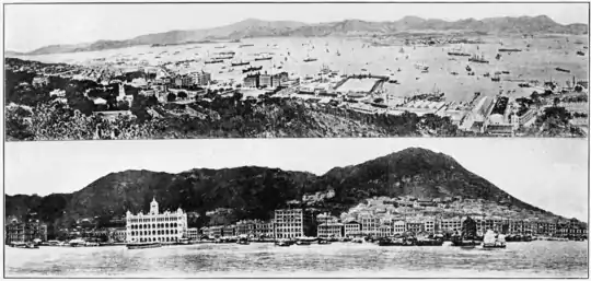 The harbor is one of the greatest ports of the world. The commercial gateway to South China and the chief distributing and trans-shipping center in the far east. 'Victoria' the chief city of Hong Kong, as seen from the harbor; showing how it is limited as well as protected by the mountainous character of the island.