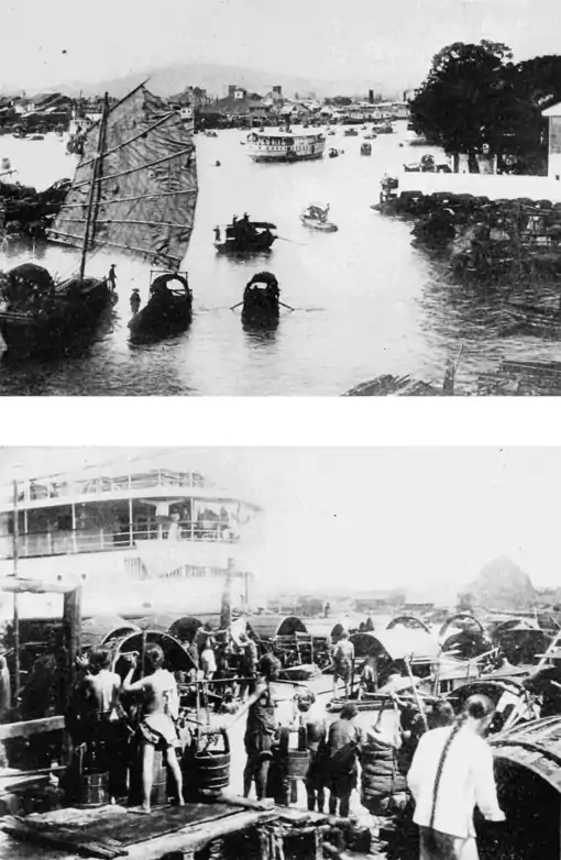 (a) Looking from Honam across the Canton River towards the city. Customs station prominent near center of river front as shown. The tall buildings are pawnshops. White Cloud Mountain appears to the north.