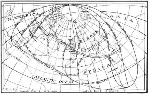 several reasons of more than usual interest. The path of the shadow passed over accessible regions, in part of which at least the weather conditions were likely to be favorable; stations could be chosen as far apart as Labrador and Egypt; the period of totality was comparatively long, and there will be no eclipse for seven years. As is shown in the illustration, the long shadow which the moon casts in space, struck the earth south of Hudson's Bay. The spot of darkness, about 120 miles broad and traveling at the rate of about 2,000 miles an hour, passed over Labrador and the Atlantic Ocean, and struck the Spanish coast at the Bay of Biscay. It traversed Leon, Burgos and Valencia, the islands of Majorca and Iviza, reached the Algerian coast near Philippeville, thence struck inland across Tunisia, skirted Tripoli, crossed the Nile at Assuan, and finally in Arabia, passed away from the earth into space again.