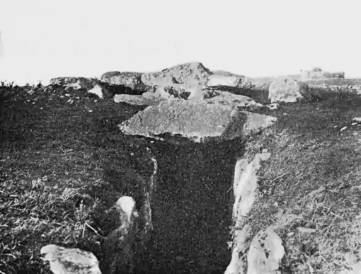 The stone cist appears to be, as a rule, of later age than the dolmen, but was likewise the receptacle of the remains of the dead and was covered with a tumulus or galgal. The great tumulus of Mont Saint Michel at Carnac, which in its eastern part seems to be composed of small stones and thus to be in the nature of a galgal, contains a number of dolmens and stone cists or cists-veu, as they are called in Brittany. A tunnel which has been driven near the base at the eastern end for the purpose of exploration has brought to view dolmens and stone cists with their contents of human bones, ashes, stone implements and ornaments, including some jadeite axes and a collar of white pearls.