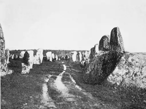 But it is in Brittany, in the region about Carnac, that are found the greatest parallel rows of menhirs with their associated cromlechs. They have here a general east and west alignment. It seems probable that originally the alignments always terminated in a cromlech, or were connected or associated with one in some way, but at present often a trace only remains of the cromlech and even this may be lacking.