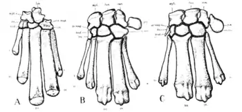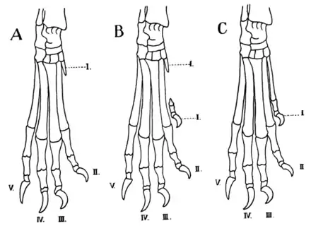 Fig. 2. A series showing the normal and polydactyl structure of the skeletal elements in the pes of the dog. A, normal pes with the rudimentary metatarsal bone of digit I.; B, a polydactyl pes, the hallux represented by two phalanges and the distal end of the metatarsal bone; C, polydactyl pes with hallux (I.) completely developed.
