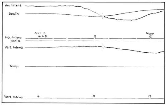 Fig. 2. Record of the San Francisco Earthquake on the Eschenhagen Magnetograph at the Magnetic Observatory, Cheltenham, Maryland, reduced 2 times. [The hours as marked are approximately local mean time. The earthquake effect will be noticed on the three magnetic elements, horizontal intensity, declination and vertical intensity in the shape of a trumpet formation between 8 and 9 a. m., local mean time. The range or double amplitude of the disturbance was about 1,1000 part of the horizontal intensity and about 1/3000 part of the vertical intensity. On account of the intersecting of the curves, the range in the magnetic declination cannot be given.]
