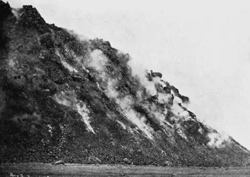 At that time Old Bogoslof, known to the sealers as Castle Island, from its appearance, was cold and dead. It showed in the fog a sheer cliff or hill of ashes about 300 or 400 feet in height, seeming much higher in the uncertain light. It was apparently the home of countless sea birds and a small herd of the gray sea lions (Eumetopias stelleri) was hauled out upon one of its slopes.
