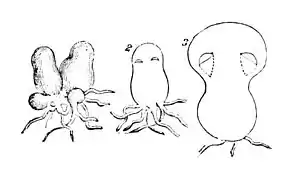To make our conception of the structure of this mushroom more complete, we will trace its growth from the beginning. The first visible portion is the mycelium, at certain points of which there appear, at an early stage, round tubercles not larger than a mustard-seed, which rapidly increase in size, push through the soil, and become more or less elongated, resembling the shaded cut in Fig. 2. There is yet no external sign of cap or gills, but a section of the tubercle will reveal