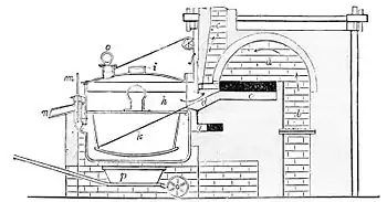 and the fire is maintained by small pieces of fuel introduced by a hole in the fire-door. The draught is then stopped by lowering the chimney-cap, or closing the damper. The vertical damper, f, is then raised, so that the flame passes by the flue, g, to a second chimney, passing thus along the slope and heating it, and also opening communication from the oven, a, to the bath, h, which is filled with the oleaginous compound. It is covered from the external air by a lid, and within it is a basket of fine wire gauze, k, hung from brackets. A tube, l, contains a thermometer, m, to indicate the temperature; and by this tube the contents of the bath may be added to, or any excess may overflow by the discharge-pipe, n. A plug, o, on the cover may be removed to