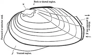 On the outside of the shell will be seen fine lines, which run nearly parallel to the outside margin of the shell. These lines are the lines of growth, and indicate the successive stages of growth, or increase of the shell, as in the lines of growth in the snail-shell already studied, and, as in the snails, the growth takes place at the margin of the shells.