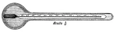 In order to apply the heat in a more regular manner, a thermometer was inserted in a glass tube, having at its extremity a glass bulb about one and a half inch diameter; it was filled with water and then sealed up (see Fig. 2). This was arranged on a revolving stand, so that by means of a cord I could bring it to the desired position without moving the eye from the micrometer. The water was kept heated to 70° C, the temperature of the laboratory being about 15° C.