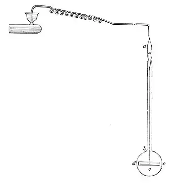as the pump will produce, strong repulsion is shown when radiation is allowed to fall on one end of the index. An apparatus of this kind, constructed with the proper precautions, and sealed off when the vacuum is perfect, is so sensitive to heat that a touch with the finger on a part of the globe near one extremity of the pith will drive the index round over 90, while it follows a piece of ice as a needle follows a magnet. With a large bulb, very well exhausted, and containing a suspended bar of pith, a somewhat striking effect is produced when a lighted candle is placed about two inches from the globe. The pith-bar commences to oscillate to and fro, the swing gradually increasing in amplitude until the dead-centre is passed over, when several complete revolutions are made. The torsion of the suspending fibre now otters resistance to the revolutions, and the bar commences to turn in the opposite direction. This movement is kept up with great energy and regularity as long as the candle burns.