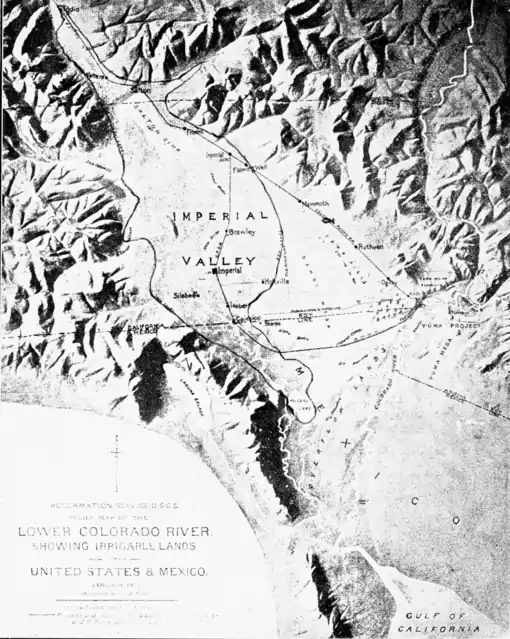 but since all this territory lies beneath the level of the sea. it is even possible for engineers to change the course of the lower part of the river, so that it would carry water from the Gulf of California to assist in the lake's completion. It may be remarked in this connection, however, that there is no probability at present of such a series of possibilities being permitted to materialize. In the light of present considerations, the value of the land and its products far outweighs the possible benefits of such a lake and inland port. Nevertheless it is a matter worthy of consideration.