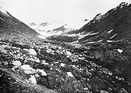 Fig. 8. Looking into Hanging Valley (Fig. 7) from Rock Lip at Elevation of 700 Feet. The stream flows in a small gorge at the right. The elevation in the middle background of the valley is the moraine-covered terminus of a dwindling glacier. The valley floor is all rock, and rock extends continuously across its mouth. Photograph by O. von Engeln.