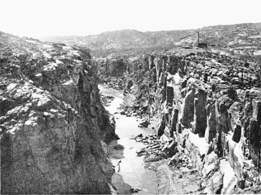 within the arid region and drains, in Wyoming, a mountainous country where the snow lingers long into the early summer. During the winter and spring the snowfall upon the peaks is considerable, and when the white mantle begins to dissolve under the increasing heat of the summer sun, the rivers are gorged with the flood waters. The North Platte, which trickles along the center of a broad gravel bed throughout the summer, a pigmy sporting the habiliments of a giant, assumes monstrous proportions at this season, swelling from a few hundred