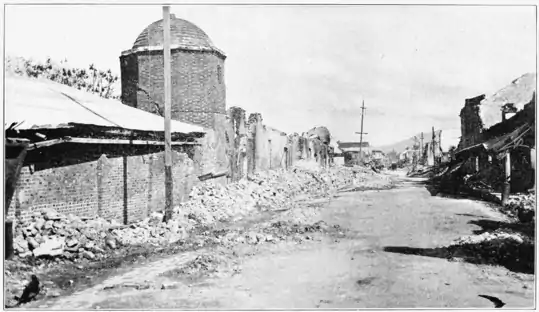 Fig. 4. Street in Business Section looking North. Western covered with débris. Crack in fireproof building, showing angle of emergence waves.