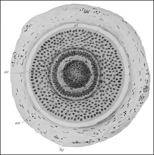 end." Still more clearly does the variety of cells which actually exists in a hair show in the following picture, which represents a cross-section of a hair, and its follicle, but more highly magnified than were the hairs in the previous figure. The adult body consists of numerous organs. These are joined together and kept in place by intervening
