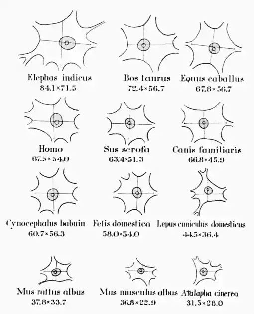 system, the nerve cells properly so called. This is demonstrated by the slide now before us, which shows us corresponding motor nerve cells of twelve different animals arranged in the order of their size—the elephant, the cow, the horse, man, the pig, the dog, the baboon, the cat, the rabbit, the rat, the mouse, and a small bat. You recognize immediately