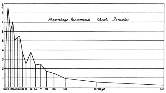 higher efficiency of growth at first. In a chicken, as in a guinea-pig, birth is a disturbing factor, and growth immediately after the hatching of the chicken is a little impeded, but the chick quickly recovers and, as we see, the first time when the rate can be distinctly measured we get a nine-per-cent. addition to the weight in a single day. In a chicken as in the guinea-pig, the rate gradually diminishes. The change from the rapid decline at first to the later slower decline is more gradual; the curve is more distinctly marked in the chicken as a round curve. There is not in the bird so marked a separation of the preliminary rapid decline and the later slower decline as we find in the guinea-pig. The curve again is very irregular because I had only a very limited number of observations upon the weight of chicks. The other sex, as the next slide will show, presents similar phenomena, though the female chickens do not grow quite as fast as their brothers. Here we notice an increase
