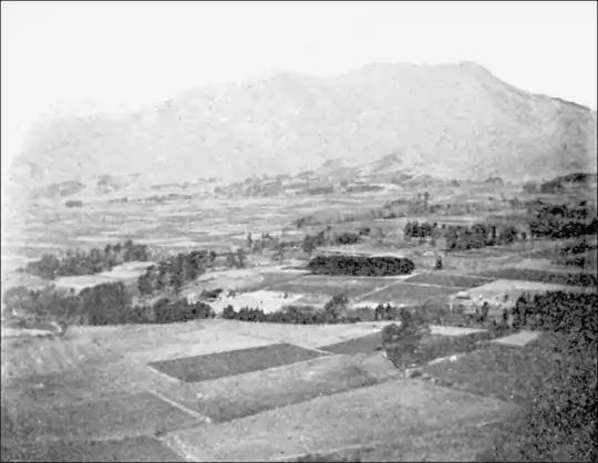 as one journeys on over the gently rolling surface of the basin floor. To the southwest the ring wall, elsewhere comparatively level-topped, rises up into mountain peaks that are between 2,500 and 3,000 feet higher than the level of the plain. To the north and northeast run the mountains that form the barrier between the two halves of the crater. They make up one massive, rugged ridge whose summit is broken by several dominating peaks. It is this range or ridge that is named Aso-san. On the summit, but at the foot of the highest peaks, at a point about half way from end to end of the Aso ridge, is situated the modern active crater from which rose the cloud that we saw from Kumamoto. A view of the rising steam puffs is again obtained as one comes out into the widening plain above the waterfall. And as one goes farther and finally reaches the central and widest portion the view of the Aso range, which was at first an endwise one and eastward, opens out until one looks to the north upon it broadside. There are three main peaks and many minor ones, the most striking of them being Neko-dake at the farther, eastern end. Its slopes have the graceful curving outlines characteristic of volcanic cones, and its summit is a jagged battlement of monumental lava pinnacles looking somewhat as if they might be the remnants of a shattered crater. Its eastern flank drops down and ends the range by blending with the converging outer walls of the two basins. The next nearest peak is Taka-dake, a higher although less distinctive summit forming the culmination of the range. It is separated from