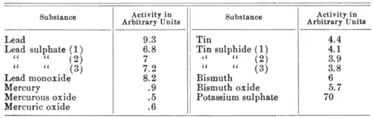 Campbell has also investigated the radioactivity of the metals and their salts in a similar way. He finds that the emission of radiations is an atomic property and that salts prepared by totally different methods and from materials derived from different sources, produce the same ionizing effect. It is only the metal that produces any measurable ionizing effect. The following are some of the results: