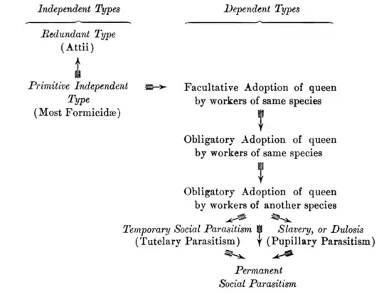or dependent stage, that is, she is unable to found a colony or even to exist apart from workers of her own species. And as the queen ant passes most of her life in similar dependence on her workers, namely, after establishing her colony, the earlier and more characteristic manifestations of her instincts and her marvelous initiative and plasticity were either disregarded or deemed to be of little importance. Attention was concentrated on the worker slave-makers whose activities represent a combination of queen and worker instincts. Darwin was thus led to derive the slave-making from the foraging instincts, and Wasmann—well Wasmann could only keep repeating or implying that the slavemaking ants made slaves, because they were endowed with a slavemaking instinct—a fine modern example of Molière's famous opium fallacy and of the resources of scholastic methods in zoology! Wasmann supposed that F. sanguinea is possessed of an extraordinary fondness for educating the young of the alien fusca. This was quite incomprehensible, especially as sanguinea workers are in no respect degenerate or dependent on their auxiliaries. Since I have examined many colonies of the European sanguinea, which, as a rule, rears much fewer auxiliaries than our American forms of the same species, Wasmann's assumption seems to me to be preposterous. After the habits of our temporary parasites and especially after the behavior of the young sanguinea queens had been studied, the relations of the dulotic species to particular hosts were easily understood, for the young queens are reared by workers of a particular host species (fusca or schaufussi or some of their varieties) or at any rate meet them frequently in the parental