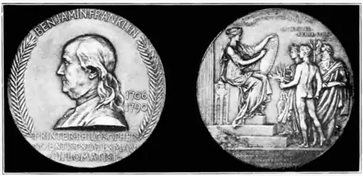 ??At the instance of the committee of the society, the congress passed an act enabling the secretary of state to have struck a medal to commemorate the two-hundredth anniversary of the birth of Franklin, one single impression in gold to be presented to the Republic of France and one hundred and fifty copies in bronze to be distributed by the president of the United States and the American Philosophical Society. The medal, designed by Louis and Augustus St. Gaudens, has under the face of Franklin the words "printer, philosopher, scientist, statesman, diplomatist," while on the reverse history writes in the presence of Literature, Science and Philosophy. This medal was presented by the secretary of state, the Hon. Elihu Root, and accepted by his excellency the French Ambassador, M. Jusserand.