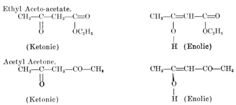 observations made it was discovered that an acid and its alkyl ester (esters formed by such, groups as methyl, CH3, ethyl, C2H5, etc.) gave identical absorption bands; a fact that pointed conclusively to the identity in molecular constitution existing between the two compounds. But among the most interesting cases bearing upon the relation of these absorption bands to chemical constitution stand the two substances acetyl acetone and ethyl aceto-acetate. We assume that each of these compounds can exist in either of two forms—one in which an oxygen atom is doubly linked to a carbon atom which bears in turn two carbon radicals and thus forms a so-called ketone; the other, where this same oxygen atom is singly linked to the carbon atom in question and has its second affinity absorbed in a hydrogen atom, thus forming a so-called hydroxyl derivative, or one usually designated by the term enolic. The two forms may be graphically represented thus: