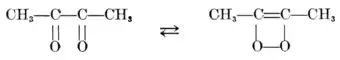 The make-and-break contact between the oxygen atoms would give marked activity to these atoms. Such a process other than tautomerism, where a wandering of a labile atom is suggested, has been named by Stewart and Baly[1] "isorropesis" (equipose), and differs from the former in that the head of its absorption band lies much nearer the red end of the spectrum or almost in the visible violet region. With the diketone known as benzil, C6H5 — CO — CO — C6H5, an absorption band with head at the oscillation frequency 3,900 was noticed in solutions of small concentrations. This would seem to indicate the presence of a certain amount of oscillation due to the benzol nucleus. The residual affinities of the two carbonyl groups are undoubtedly fixed, to some extent, by the free affinities of the benzol molecule, but even so there may be present a small amount of isorropesis between the two carbonyl groups. That such is really the case is demonstrated in solutions of greater concentration by the presence of a very shallow absorption band with head at the oscillation frequency 2,650. Its shallowness, however, argues for only a slight isorropesis; indeed the color of benzil, which is but faintly yellow, may be made to disappear entirely