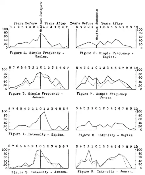 The irregular periods numbered 3 and 7 are necessary because of the variation of the length of the sun-spot cycle. Number 3 may vary in length from 1 to 7 years, and number 7 from 0 to 3.