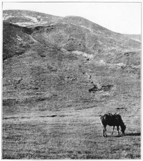 these latter are most fascinating. The larger, deeper pools are near the "hotel," and the Geyser itself is the center of a mound of sinter, about a stone's throw away. It forms a large circular pool, whose floor shelves off to a wide descending pipe, into which one eagerly strains one's eyes for a possible glimpse at the infernal machinery which works them all. It keeps its opaline eye staring wide open, sheds a few tears from time to time, which pour in little cascades down the slant outer sides, but never, by any chance rewards the tired spectator with an explosion. Still Geyser is an exciting sort of place, and what its bigger brother fails to do a much smaller fountain meritoriously endeavors to perform. In the morning and afternoon this industrious steam-pipe gets to work, and shoots up a column some fifteen to twenty feet high, and what is missed in magnitude is made up in the number and continuity of its emissions. It makes a very commendable restitution for the patience lost on its big somnolent companion. There is a very wide and profuse deposit of geyserite at this place which may extend a mile or so outward to the south from the hills north of the "hotel." Above the geyser plain on the hillside, about one hundred