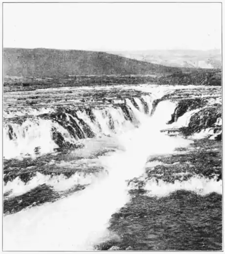 The climax was the Gullfoss. For half a century travelers who have reached this waterfall have given it their enthusiastic esteem, and as a "show card" for Iceland it's a winner. It is not so large, so immense; it does not possess mere physical dimensions, but it is a spectacle of astonishing beauty, and is so set in the loneliness of nature as to produce an astonishingly strong and thrilling impression. You come suddenly in view of it after the gallop over the sand plain, and its roar, the distant confused movement of the water and the shooting spires of spray fairly daunt you. Here the waters of the Hvitaau pour over one palisade of rock about forty feet high, and turning a right angle tumble about one hundred feet into the whirling resounding gulf of a narrow, deep canon that is cut southward between walls about three hundred feet high, which again farther south become almost one thousand feet in height. The upper fall is broken by intercepting partitions of rock. The falls are in process of recession, and the upper, by the more rapid removal of the possibly more easily disintegrated middle bed of rock, has slipped away from its lower companion. As the water boils and surges over the descending shelf between the upper and lower falls, it makes a very turbulent display.