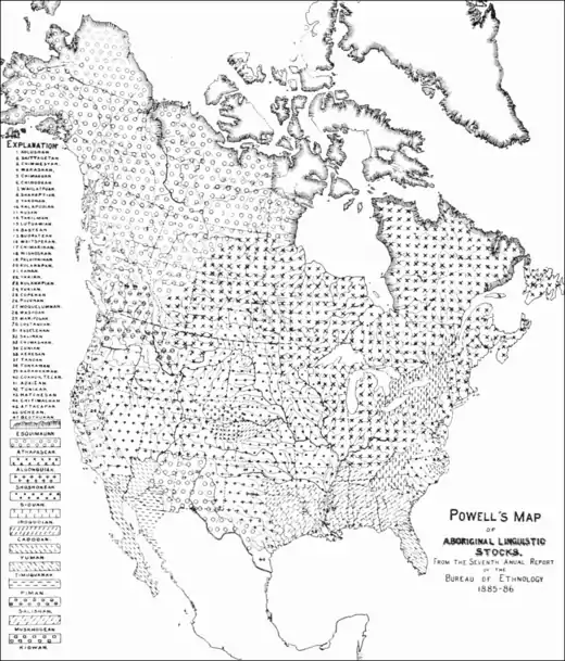 also were in this central area, are thought by some to be an independent stock, but by others related to the Comanches, and hence may, for our present purpose, be classed with the Comanches in the Shoshonean family. The Pawnee, or Caddoan, family was feebly represented in the interior of the continent aside from their main habitat at the gulf coast and in Texas; but the Iroquois shared with the other wide-spread families in the possession of the interior. These, however, appear to have linguistic alliances with the Cherokees and more distantly with the