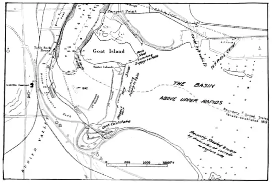 The effect of this is to extend forward the rock rim of the basin. Behind this wall, they removed the rock floor, in some places to a depth of seven feet, so that there is now a general depth in their dam of some six feet below the surface of the barrier, over which the water flows as if naturally. By taking the water from the bottom of the dam, while the river is still flowing over the top, the same effect is produced as if it were taken by a tunnel from any part of the floor of the basin of the Upper Rapids, and so increases the discharge from the basin.