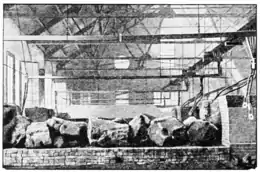 | Carborundum Furnace with Walls removed after Heating, showing blocks of crystalline carborundum. | Electric Furnaces of the Resistance Type in which Artificial Graphite is made. |