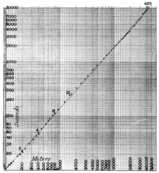 somewhat higher, than those represented by the line. Then, from 500 to 5,000 meters, the dots fall above the line. That is, the times are longer, or speeds somewhat lower, than those prescribed by the line within this range. From 5,000 to 12,000 meters, the agreement between the dots and the line is close. Between 12,000 meters and 32,000 meters, the clots again fall below the line; while beyond 32,000 meters, they change sides and rise above it.