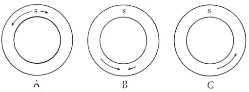 transmits them is almost certain to be more complete on one side than on the other of any stimulated point. Of course the waves meet as in Fig. 2, B, and then the strong wave destroys the weak one and continues around the ring. There is then only one wave left in the circuit and this travels constantly around (Fig. 2, C) for hours or days until something stops it. such as the cutting of the circuit or a fresh stimulus which produces a wave that meets and destroys it.