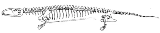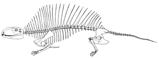 In Dimetrodon, the last of the series, these characters reached their culmination. The incisor and canine tusks have attained a relatively enormous length and strength, and projected from the jaws as much as three inches; the diastemal notch is larger and deeper and the posterior teeth of the jaws are recurved and have sharp serrate edges so they had all the cutting power of a Malay kris. Could a more effective arrangement be imagined for the cruel business of capturing and holding living prey despite its desperate struggles? The spines on the back developed to enormous length and in some forms tapered to the slenderness of a whip lash. The tail was short and the feet strong and with well-developed claws, all going to show that the animal was terrestrial in habit. The largest species of Dimetrodon reached a length of about eight feet and was easily the largest, strongest animal of its time. We can imagine this fiercely carnivorous form crouching in the bushes or tall grass on the side of some stream and making a