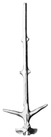 Fig. 7. Front View of One of the Dorsal Spines of Naosaurus. its unsuspecting prey. This last is perhaps a fair suggestion, but it seems that the physiological burden of maintaining such an essentially weak structure must have far outweighed any conceivable advantage of concealment. The spines were slender and were constantly subject to fracture in battle or by accident and the animal must have expended no inconsiderable portion of its energies in repairing the broken structure.