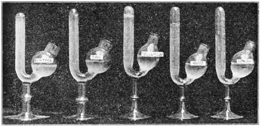 Fig. 10. yeast cake in 250 c.c. of a 5 per cent, solution of cane-sugar. Into four of the fermentation tubes were placed sealed glass tubes as follows: RaBr2 1,500,000 X; 10,000 X; 7,000 X; radio-tellurium. The fifth served as a control. At the end of about three and one half hours the cultures were photographed (Fig. 11). It is clearly shown in the figure that the rate of alcoholic fermentation, as measured by the evolution of gas, was accelerated by the rays; most by the preparation of 1,500,000 activity, least by that of 7,000 activity, and to an intermediate degree by the other preparations.