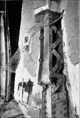 An Insufficiently protected Steel column after a fire. it to say that in general terms it means the avoidance of anything combustible. But farther than that it is also well to remember that many materials that are in themselves incombustible, non-inflammable, are most seriously damageable, nevertheless, by flame or great heat. Iron, for instance, can not burn but subjected to heat it will twist and contort and in column form, as an illustration, it will collapse to the utter destruction of whatever it is supporting. So that many materials have in turn to be protected from fire though they will not themselves burn. Many people imagine that stone represents the very epitome of safe and permanent construction, yet all granites, marbles, sand and limestones spall and go to pieces under severe fire tests. My idea of a perfectly fire-proof building, therefore, is one whose exterior walls are of undamageable material, brick and terra-cotta, products that have gone