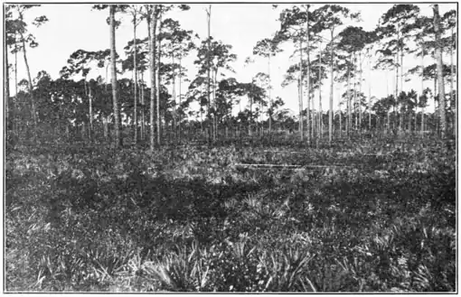 below or above the water level. Areas where the sand rises above the water constitute the islands. There are about half a dozen of these, Floyd's Billy's, Mitchell's, Black Jack, Honey and Bugaboo, with areas ranging from about one to ten square miles. The largest islands are naturally highest and driest, and are said to bear a fine growth of long-leaf pine (Pinus palustris), and perhaps some oaks and hickories. The only island which Mr. Ricker and the writer were able to reach (on account of the low stage of water prevailing at the time of our visit,